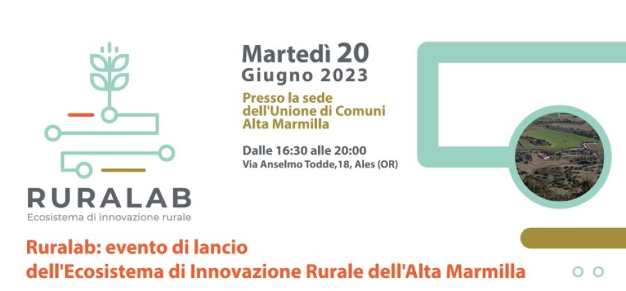 Si invitano tutti i cittadini a partecipare all'incontro ''Ruralab: evento di lancio dell'Ecosistema di Innovazione Rurale dell'Alta Marmilla'', che si terrà martedì 20 giugno 2023 dalle 16:30, presso la sede dell'Unione di Comuni Alta Marmilla, in Via Anselmo Todde n. 18 Ales (OR).
